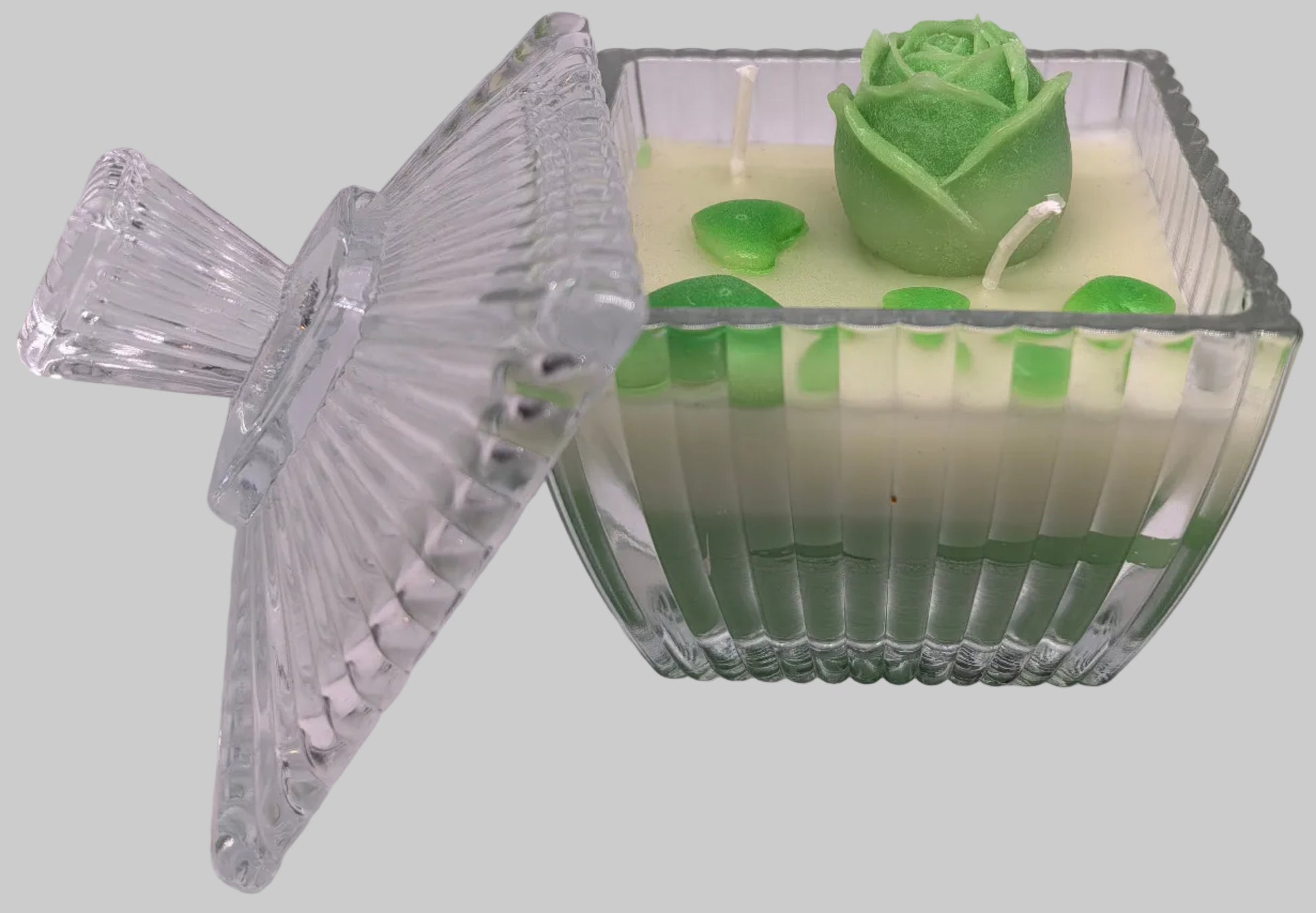 Cette coupe serait née dans un ancien verger sacré, là où les druides cueillaient les fruits encore chargés de rosée pour préparer leurs rituels de renouveau et de clarté. La rose verte qui veille en son centre symbolise l’équilibre entre la croissance et la sagesse, tandis que les gouttes de cire rappellent la sève lente qui nourrit la terre au printemps.